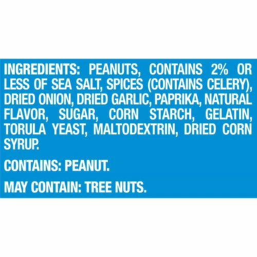 Peanuts, Contains Less than 2% of Sea Salt, Spices (Contains Celery), Dried Onion, Dried Garlic, Paprika, Natural Flavor, Sugar, Corn Starch, Gelatin, Torula Yeast, Maltodextrin, Dried Corn Syrup.