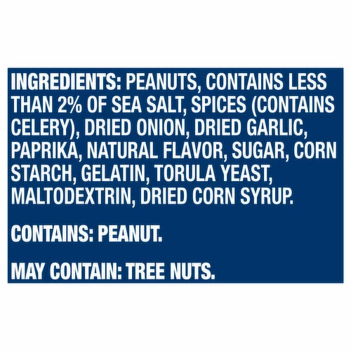 Peanuts, Contains Less than 2% of Sea Salt, Spices (Contains Celery), Dried Onion, Dried Garlic, Paprika, Natural Flavor, Sugar, Corn Starch, Gelatin, Torula Yeast, Maltodextrin, Dried Corn Syrup.