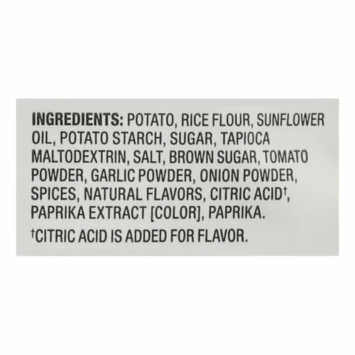 Potato, Rice Flour, Vegetable Oil (Sunflower, Safflower and/or Expeller Pressed Canola), Potato Starch, Sugar, Tapioca Maltodextrin, Salt, Brown Sugar, Tomato Powder, Garlic Powder, Onion Powder, Spices, Natural Flavors, Citric Acid (Citric Acid is Added for Flavor), Paprika Extract [Color], Paprika.
