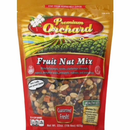 Blend of peanuts, raisins, cranberries, almonds, papaya, pumpkin seeds, pineapple, walnuts, and pistachios. Stay fresh resealable zipper. New look, same great taste! Per 1/4 Cup Serving: 130 calories; 1 g sat fat (4% DV); 60 mg sodium (3% DV); 10 g sugars. Guaranteed fresh! Health Facts: Gluten free; cholesterol & trans fat free: Naturally Contains: plant protein, antioxidants, magnesium, phytosterols – good fat. Since 1986, we have taken pride in our achievement to be a quality leader in dry oven roasting and packaging: nuts, seeds, dried fruits and mixes. Products are sourced only from the finest selected growers. With our convenient resealable package, you can indulge yourself with Premium Orchard products – the most delicious and nutritious snack – anytime, anywhere! Did You Know? Fruit Nut Mix can be nutritious substitute to any meal. Great snack to sustain long lasting energy. Nuts and dried fruits actually help curb appetite. Peanuts are a source of: folate, protein, fiber and antioxidants. Phytosterols is a good fat. Lowers LDL (bad) cholesterol. www.PremiumOrchard.com. Please recycle. Processed & packed in USA.