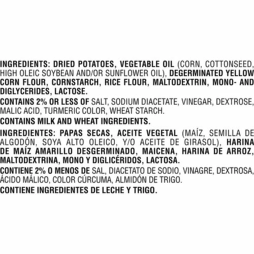 Dried Potatoes, Vegetable Oil (Corn, Cottonseed, High Oleic Soybean And/Or Sunflower Oil), Degerminated Yellow Corn Flour, Cornstarch, Rice Flour, Maltodextrin, Mono- And Diglycerides, Lactose. Contains 2% Or Less Of Salt, Sodium Diacetate, Vinegar, Dextrose, Malic Acid, Turmeric Color, Wheat Starch.