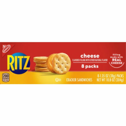 RITZ Cheese Sandwich Crackers are the classic go-anywhere snack that kids and adults have loved for years, layering smooth, creamy cheese between two crisp RITZ snack crackers. The mouthwatering filling is made with real cheese and meets kosher dairy requirements to satisfy various dietary preferences. Individually wrapped for freshness and portability, these cracker sandwiches make a great snack anytime you’re craving crackers and cheese. Toss these RITZ snack packs in your child’s lunch for a special treat, keep some in your desk drawer for a convenient snack, or stow these cracker packs in your backpack for a quick bite on your next long hike. One box with 8 snack packs of 6 RITZ Cheese Sandwich Crackers