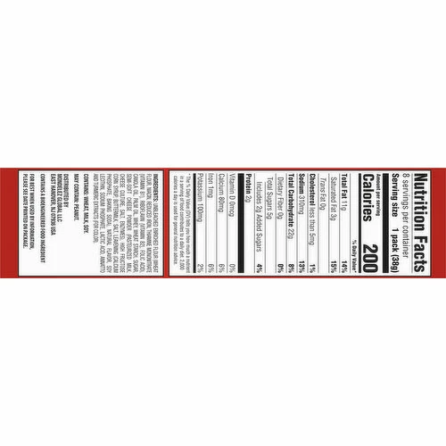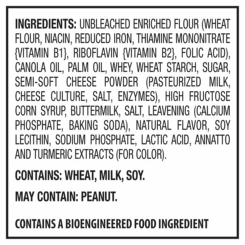 Unbleached Enriched Flour (Wheat Flour, Niacin, Reduced Iron, Thiamine Mononitrate {Vitamin B1}, Riboflavin {Vitamin B2}, Folic Acid), Canola Oil, Palm Oil, Whey, Wheat Starch, Sugar, Semi-Soft Cheese Powder (Pasteurized Milk, Cheese Culture, Salt, Enzymes), High Fructose Corn Syrup, Buttermilk, Salt, Leavening (Calcium Phosphate, Baking Soda), Natural Flavor, Soy Lecithin, Sodium Phosphate, Lactic Acid, Annatto and Turmeric Extracts (for Color).
