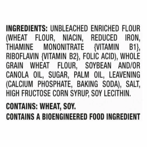 Unbleached Enriched Flour (Wheat Flour, Niacin, Reduced Iron, Thiamine Mononitrate {Vitamin B1}, Riboflavin {Vitamin B2}, Folic Acid), Whole Grain Wheat Flour, Soybean and/or Canola Oil, Sugar, Palm Oil, Leavening (Calcium Phosphate, Baking Soda), Salt, High Fructose Corn Syrup, Soy Lecithin.