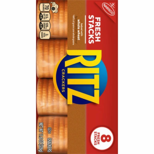 RITZ Fresh Stacks Whole Wheat Crackers are the classic RITZ crackers you love, now baked with the goodness of whole wheat. In addition to their rich, buttery flavor, these snack crackers pack five grams of whole wheat per 15 gram serving. Whether it’s a formal event or a gathering of friends, these whole wheat crackers are ideal for any occasion. RITZ salted crackers have a classic taste that pairs well with a variety of toppings, dips, cheeses and they’re a great snack food on their own. Add this box of RITZ cracker packs to your shelf of salty snacks for a treat that is quick, convenient and portable. Each 11.6 ounce box contains eight stacks of RITZ Whole Grain Crackers. Fresh Stacks contain 13 crackers each and are individually wrapped to maintain freshness and flavor.