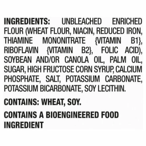 Unbleached Enriched Flour (Wheat Flour, Niacin, Reduced Iron, Thiamine Mononitrate {Vitamin B1}, Riboflavin {Vitamin B2}, Folic Acid), Soybean and/or Canola Oil, Palm Oil, Sugar, High Fructose Corn Syrup, Calcium Phosphate, Salt, Potassium Carbonate, Potassium Bicarbonate, Soy Lecithin.