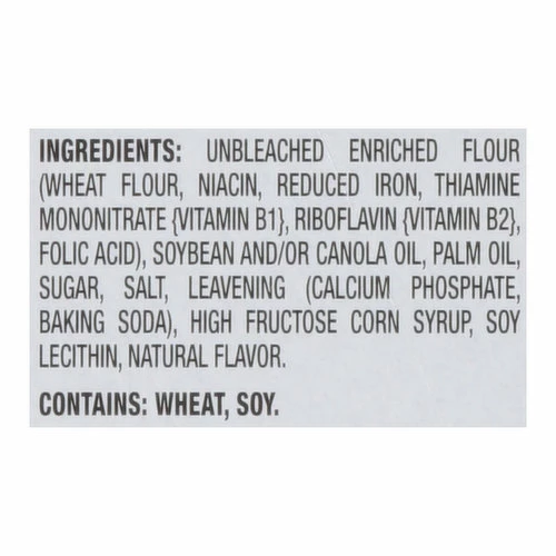 Unbleached Enriched Flour (Wheat Flour, Niacin, Reduced Iron, Thiamine Mononitrate {Vitamin B1}, Riboflavin {Vitamin B2}, Folic Acid), Soybean and/or Canola Oil, Palm Oil, Sugar, Salt, Leavening (Calcium Phosphate, Baking Soda), High Fructose Corn Syrup, Soy Lecithin, Natural Flavor.