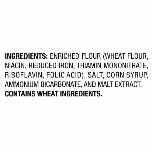 Enriched Flour (Wheat Flour, Niacin, Reduced Iron, Thiamin Mononitrate, Riboflavin, Folic Acid), Salt, Corn Syrup, Ammonium Bicarbonate, and Malt Extract.