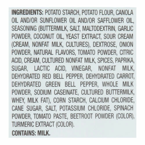 Potato Starch, Potato Flour, Canola Oil and/or Sunflower Oil and/or Safflower Oil, Seasoning (Buttermilk, Salt, Maltodextrin, Garlic Powder, Coconut Oil, Yeast Extract, Sour Cream (Cream, Nonfat Milk, Cultures), Dextrose, Onion Powder, Natural Flavors, Tomato Powder, Citric Acid, Cream, Cultured Nonfat Milk, Spices, Paprika, Sugar, Lactic Acid, Vinegar, Nonfat Milk, Dehydrated Red Bell Pepper, Dehydrated Carrot, Dehydrated Green Bell Pepper, Whole Milk Powder, Sodium Caseinate, Cultured Buttermilk, Whey, Milk Fat), Corn Starch, Calcium Chloride, Cane Sugar, Salt, Potassium Chloride, Spinach Powder, Tomato Paste, Beetroot Powder (Color), Turmeric Extract (Color).