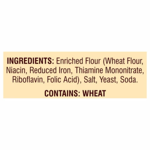 Enriched Flour (Wheat Flour, Niacin, Reduced Iron, Thiamine Mononitrate, Riboflavin, Folic Acid), Salt, Yeast, Soda.
