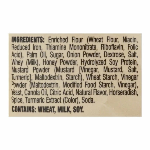 Enriched Flour (Wheat Flour, Niacin, Reduced Iron, Thiamine Mononitrate, Riboflavin, Folic Acid), Palm Oil, Sugar, Onion Powder, Dextrose, Salt, Whey (Milk), Honey Powder, Hydrolyzed Soy Protein, Mustard Powder (Mustard [Vinegar, Mustard, Salt, Turmeric], Maltodextrin, Starch), Wheat Starch, Vinegar Powder (Maltodextrin, Modified Food Starch, Vinegar), Yeast, Canola Oil, Citric Acid, Natural Flavor, Horseradish, Spice, Turmeric Extract (Color), Soda.