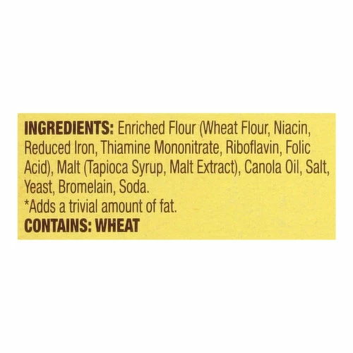Enriched Flour (Wheat Flour, Niacin, Reduced Iron, Thiamine Mononitrate, Riboflavin, Folic Acid), Malt (Tapioca Syrup, Malt Extract), Canola Oil, Salt, Yeast, Bromelain, Soda. Adds a Trivial Amount of Fat.