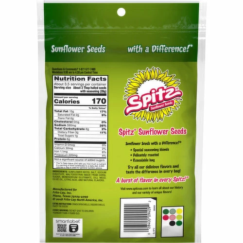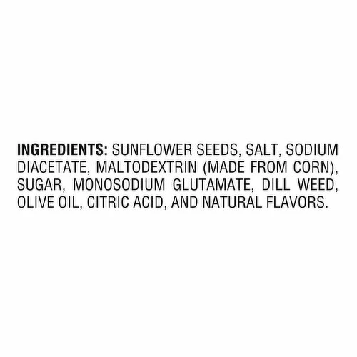 Sunflower Seeds, Salt, Sodium Diacetate, Maltodextrin (Made From Corn), Sugar, Monosodium Glutamate, Dill Weed, Olive Oil, Citric Acid, and Natural Flavors.