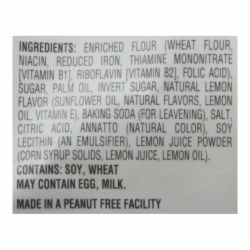 Enriched Flour (Wheat Flour, Niacin, Reduced Iron, Thiamine Mononitrate [Vitamin B1], Riboflavin [Vitamin B2], Folic Acid), Sugar, Palm Oil, Invert Sugar, Natural Lemon Flavor (Sunflower Oil, Natural Flavors, Lemon Oil, Vitamin E), Baking Soda (for Leavening), Salt, Citric Acid, Annatto (Natural Color), Soy Lecithin (an Emulsifier), Lemon Juice Powder (Corn Syrup Solids, Lemon Juice, Lemon Oil).