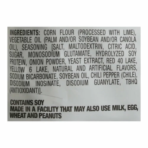Corn Flour (Processed with Lime), Vegetable Oil (Palm and/or Soybean and/or Canola Oil), Seasoning [Salt, Maltodextrin, Citric Acid, Sugar, Monosodium Glutamate, Hydrolyzed Soy Protein, Onion Powder, Yeast Extract, Red 40 Lake, Yellow 6 Lake, Natural and Artificial Flavors, Sodium Bicarbonate, Soybean Oil, Chili Pepper (Chile), Disodium Inosinate, Disodium Guanylate, TBHQ (Antioxidant)].