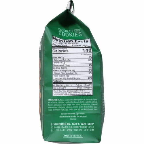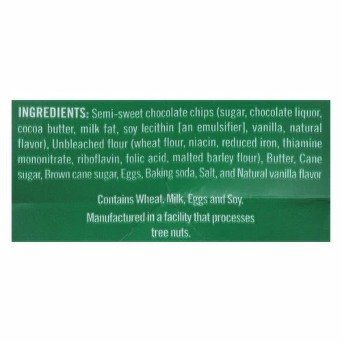 Semi-Sweet Chocolate Chips (Sugar, Chocolate Liquor, Cocoa Butter, Milk Fat, Soy Lecithin [an Emulsifier], Vanilla, Natural Flavor), Unbleached Flour (Wheat Flour, Niacin, Reduced Iron, Thiamine Mononitrate, Riboflavin, Folic Acid, Malted Barley Flour), Butter, Cane Sugar, Brown Cane Sugar, Eggs, Baking Soda, Salt, and Natural Vanilla Flavor.