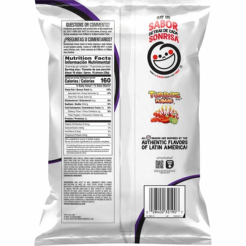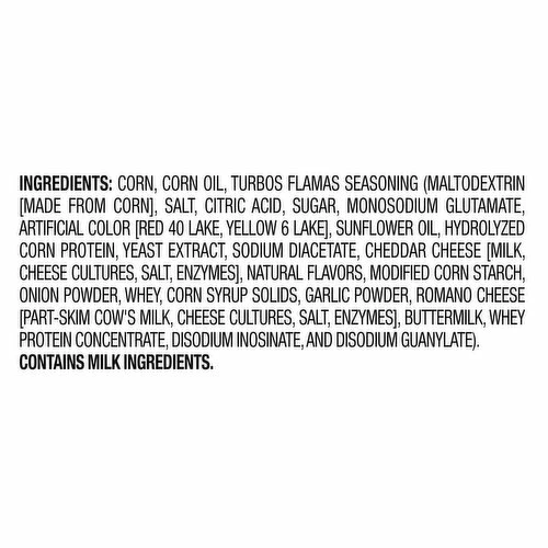 Corn, Corn Oil, Turbos Flamas Seasoning (Maltodextrin [Made from Corn], Salt, Citric Acid, Sugar, Monosodium Glutamate, Artificial Color [Red 40 Lake, Yellow 6 Lake], Sunflower Oil, Hydrolyzed Corn Protein, Yeast Extract, Sodium Diacetate, Cheddar Cheese [Milk, Cheese Cultures, Salt, Enzymes], Natural Flavors, Modified Corn Starch, Onion Powder, Whey, Corn Syrup Solids, Garlic Powder, Romano Cheese [Part-Skim Cow’s Milk, Cheese Cultures, Salt, Enzymes], Buttermilk, Whey Protein Concentrate, Disodium Inosinate, and Disodium Guanylate).