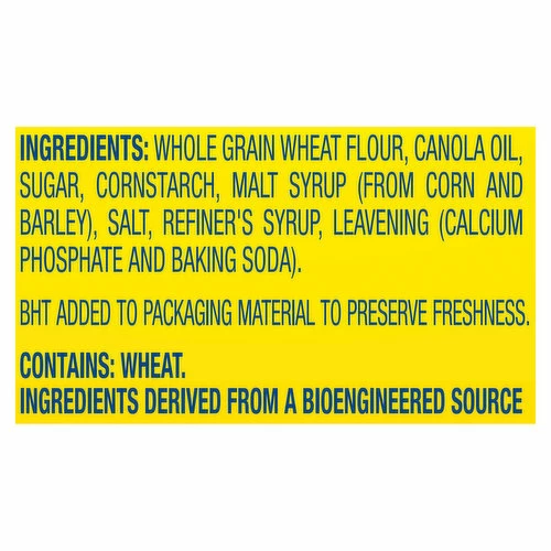 Whole Grain Wheat Flour, Canola Oil, Sugar, Cornstarch, Malt Syrup (from Corn and Barley), Salt, Refiner’s Syrup, Leavening (Calcium Phosphate and Baking Soda).