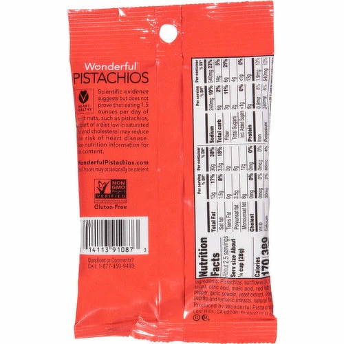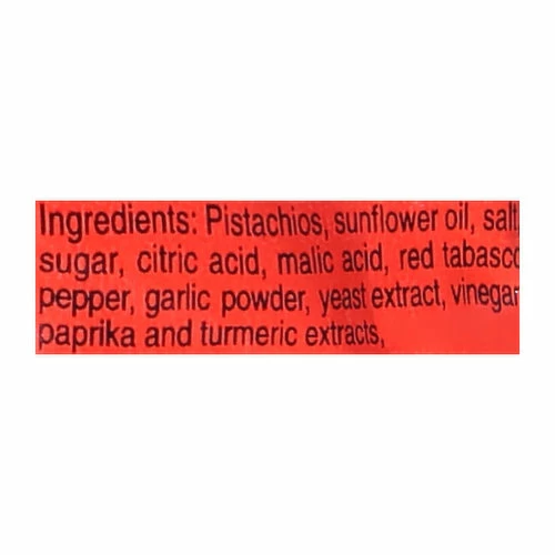 Pistachios, Sunflower Oil, Salt, Sugar, Citric Acid, Malic Acid, Red Tabasco Pepper, Garlic Powder, Yeast Extract, Vinegar, Paprika and Turmeric Extracts, Natural Flavor.