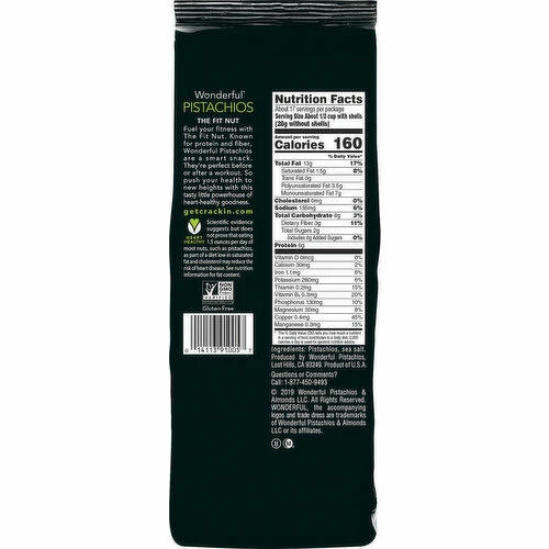 Halal. Heart healthy. Scientific evidence suggests but does not prove that eating 1.5 ounces per day of most nuts, such as pistachios, as part of a diet low in saturated fat and cholesterol may reduce the risk of heart disease. See nutrition information for fat content. Non GMO Project Verified nngmoproject.org. The fit nut fuel your fitness with the fit nut. Known for protein and fiber, wonderful pistachios are a smart snack. They’re perfect before or after a workout. So push your health to new heights with this tasty little powerhouse of heart-healthy goodness. getcrackin.com. Questions or comments? Call 1-877-450-9493. Product of USA.